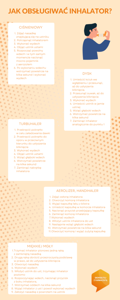 Na rynku istnieją różne rodzaje inhalatorów, których obsługa może się różnić. W aptece najczęściej spotykane są inhalatory ciśnieniowe dozujące (pMDI), proszkowe (DPI) oraz miękkiej mgły (soft mist).